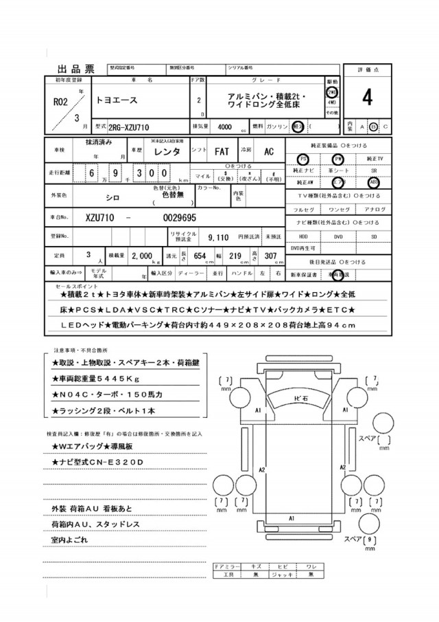 ★積載2t★トヨタ車体★新車時架装★アルミバン★左サイド扉★ワイド★ロング★全低床★PCS★LDA★VSC★TRC★Cソナー★ナビ★TV★バックカメラ★ETC★LEDヘッド★電動パーキング★荷台内寸約449×208×208荷台地上高94cm★取説・上物取説・スペアキー2本・荷箱鍵★車両総重量5445Kg★N04C・ターボ・150馬力★ラッシング2段・ベルト1本★Wエアバッグ★導風板