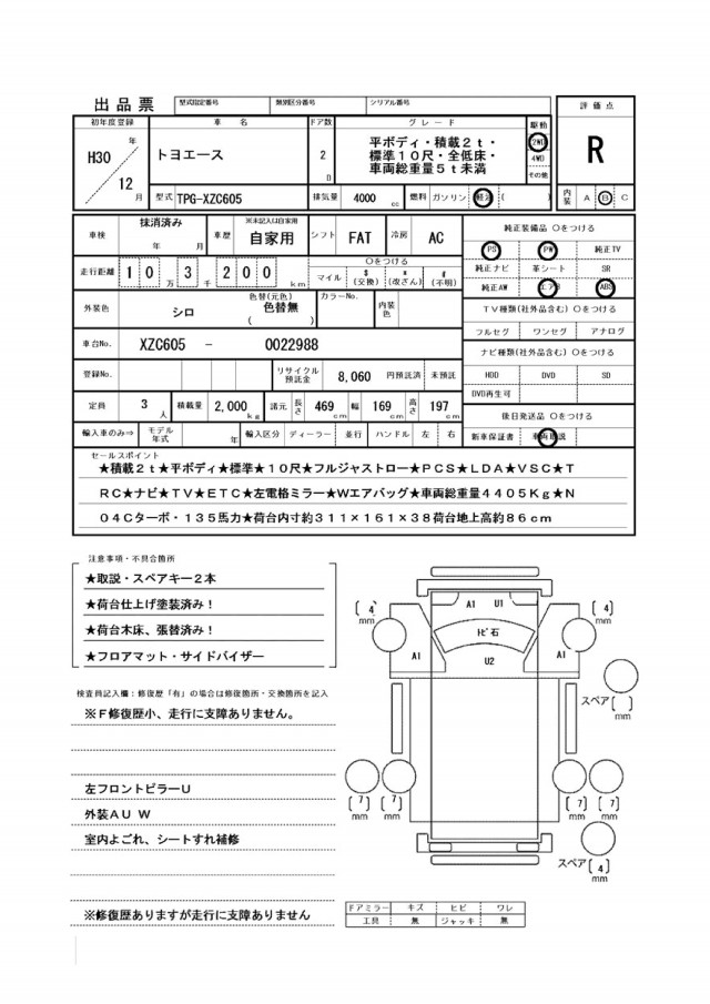 ★積載2t★平ボディ★標準★10尺★フルジャストロー★PCS★LDA★VSC★TRC★ナビ★TV★ETC★左電格ミラー★Wエアバッグ★車両総重量4405Kg★N04Cターボ・135馬力★荷台内寸約311×161×38荷台地上高約86cm★取説・スペアキー2本★荷台仕上げ塗装済み!★荷台木床、張替済み!★フロアマット・サイドバイザー※F修復歴小、走行に支障ありません。