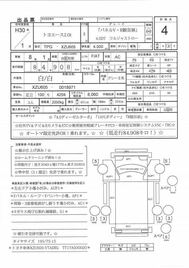 ☆H30年トヨエース2.0tフルジャストロー『パネルV・R観音扉』10尺ボディー☆(低走行84,908キロ!)☆(衝突被害軽減ブレーキPCS・車両安定制御システムVSC・TRC)☆『社外1セグTV&ナビ&Bカメラ&ETC』☆準中型(5t限定)免許で乗れます。☆オートマ限定免許OK!乗れます。☆遠方の方でも安心!ルームクリーニング済み!☆展示仕上げ済み!☆
