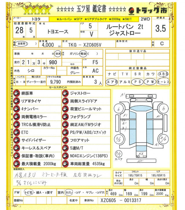 ☆ジャストロー☆絶版車☆リアWタイヤ☆両側スライドドア☆4ナンバー☆荷室ビニールマット☆両側電格ミラー☆フォグランプ☆TRC&横滑防止装置☆ETC☆純正AM/FMラジオ☆PS/PW/ABS/エアバック☆サイドバイザー☆フロアマット☆キーレス&スペア☆保証書/取説