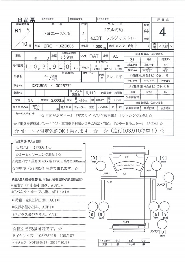 ☆R1年トヨエース2.0tフルジャストロー『アルミV・左スライド・R観音扉』10尺ボディー☆(走行103,910キロ)『衝突被害軽減ブレーキPCS・車両安定制御システムVSC・TRC』『W/SRSエアバック&ABS』『カラーBモニター』『社外ETC!』『ラッシング2段!』『左電動格納ミラー』☆準中型(5t限定)免許で乗れます。☆オートマ限定免許OK!乗れます。☆遠方の方でも安心!ルームクリーニング