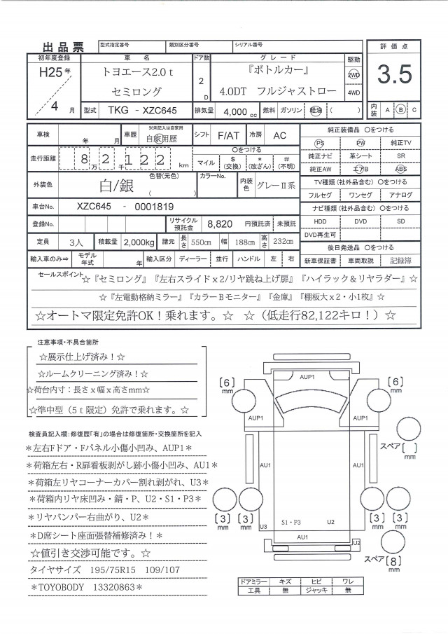 ☆H25年トヨエース2.0t『セミロング』FJL『ボトルカー』左右スライドⅹ2/リヤ跳ね上げ扉☆(低走行82,122キロ!)『ハイラック&リヤラダー』『金庫』『カラーBモニター』『左電動格納ミラー』『棚板大ⅹ2・小ⅹ1枚』☆準中型(5t限定)免許で乗れます。☆オートマ限定免許OK!乗れます。☆遠方の方でも安心!ルームクリーニング済み!☆展示仕上げ済み!☆