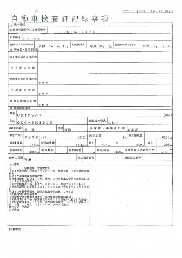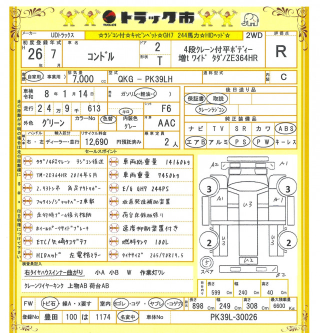 右タイヤハウスインナー曲がり 小A 小B W 作業灯ワレ クレーンワイヤーキンク 上物AB 荷台AB