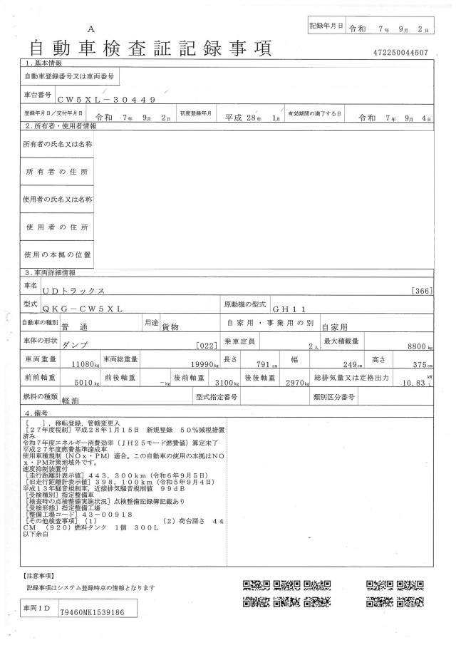 ★ハイルーフ!! ★2デフ!! ★造りボディ!!デカ箱!! ★リーフサス ★車検切れナンバー付!! ★実走行 ★10830cc(ターボ380馬力) ★2人乗り ★ミッション エスコットⅤ(2ペダル) ★ベッド付き ★積載8800kg ★大型ダンプ ★電動コボレーン ★荷台全面ステンレス張り ★上物 新明和製 DR11-03SB