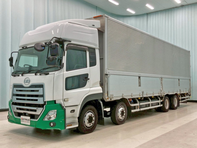 UD・大型・3軸高床・後輪エアサスのアルミウイングです! 390PS・ミッションは2ペダルのエスコットⅥで運転しやすい車輛です。 ウイングはトレクス製で内寸:L-9.62m W-2.40m H-2.49m 門高-2.42m 積載14,000kgです。 床は板張り、ラッシング2段となります。 キャブ回りはメッキがついており、キャブの色と相まってかっこよく決まっています。 キャビンはハイルーフでバックカメラも付いており、後付けの必要もございません。 価格・状態などお気軽にお問い合わせください!