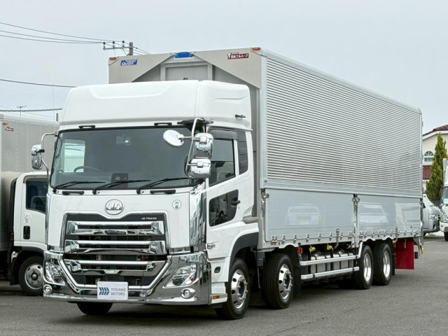 自社レンタUP★ハイルーフ・リアエアサス・融雪仕様・4軸低床・アクティブステアリング付・ラッシング2段・フック9対・床竹合板・セイコーラック・アルミホイール